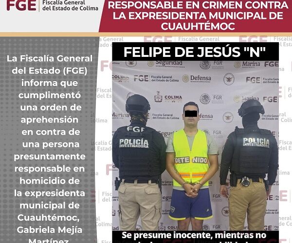 La Fiscalía General del Estado (FGE) informa que cumplimentó una orden de aprehensión en contra de una persona presuntamente responsable en homicidio de la expresidenta municipal de Cuauhtémoc, Gabriela Mejía Martínez. Derivado del trabajo coordinado entre la Policía de Investigación ...