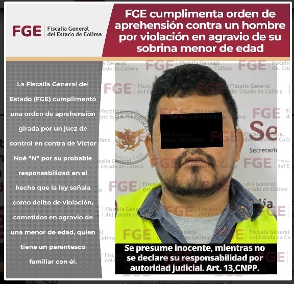 La Fiscalía General del Estado (FGE) cumplimentó una orden de aprehensión girada por un juez de control en contra de Víctor Noé “N” por su probable responsabilidad en el hecho que la ley señala como delito de violación cometido en agravio de una menor de edad, quien tiene un parentesco familiar con él.